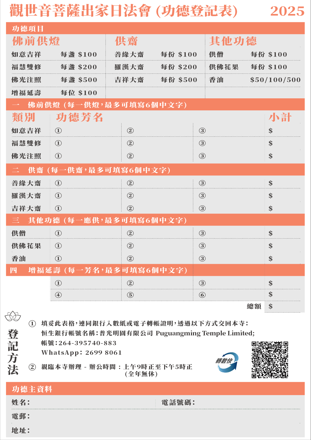 法會當天設有佛前供燈、供僧、供齋等功德,請使用「觀世音菩薩成道日法會功德登記表格」,廣種福田。