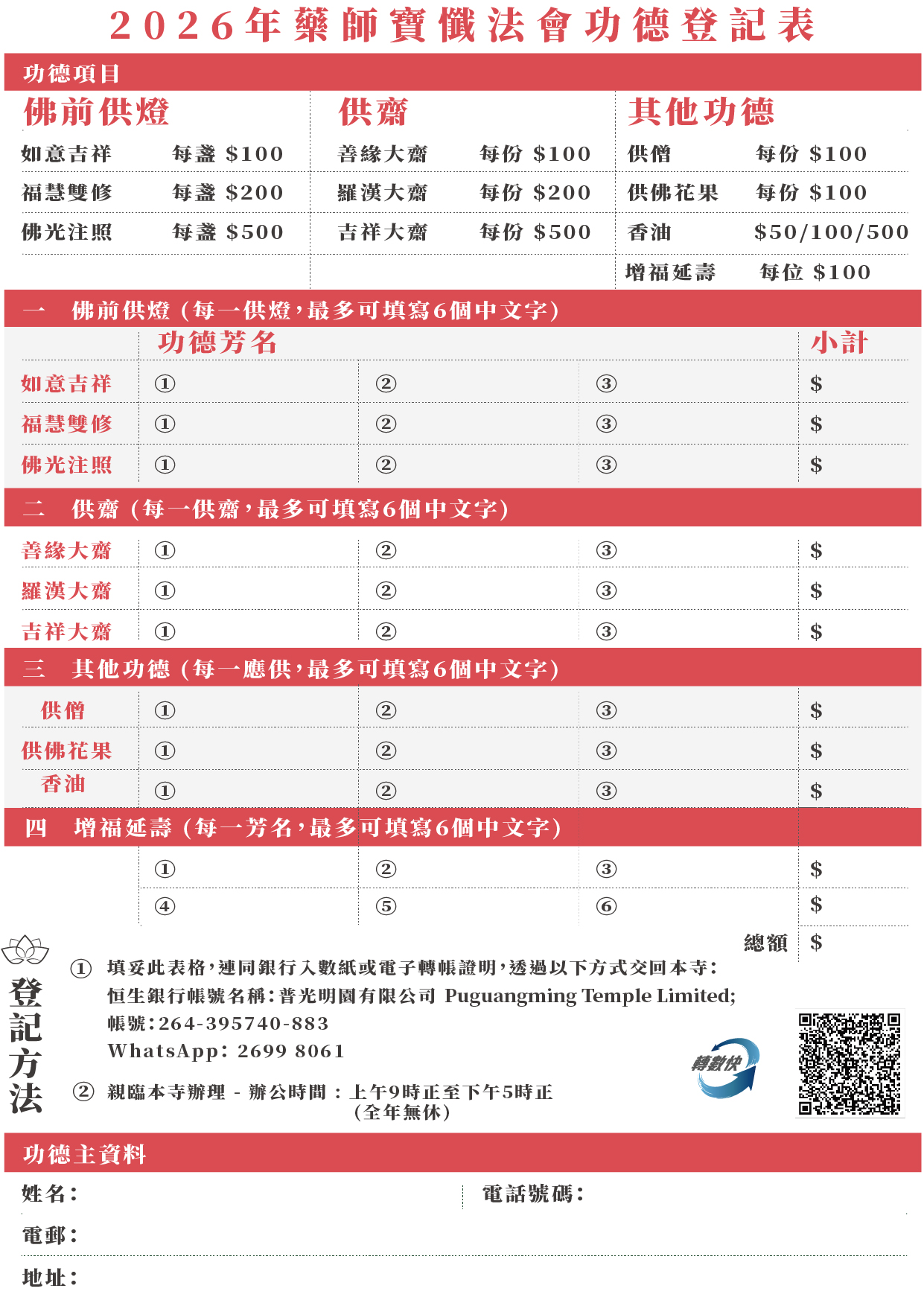 法會當天設有佛前供燈、供僧、供齋等功德,請使用「藥師寶懺法會功德登記表格」,廣種福田。