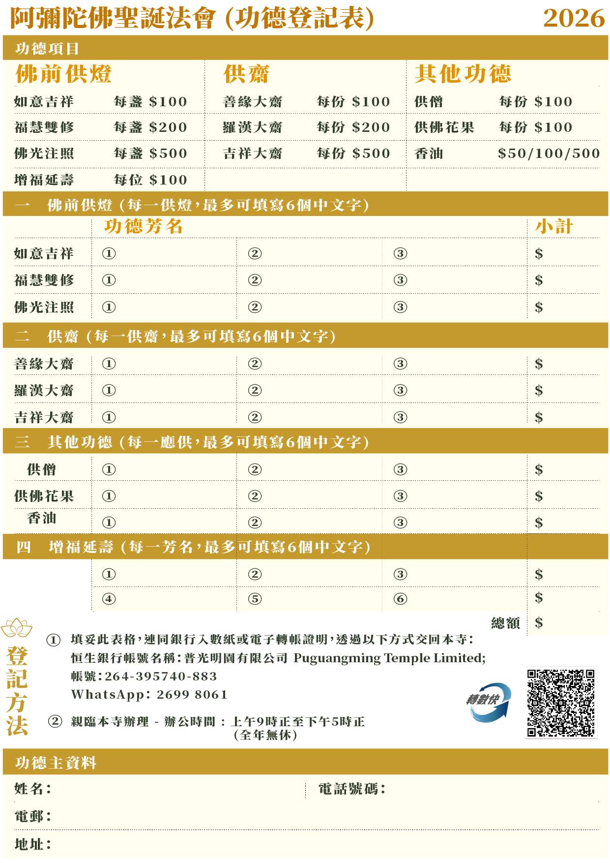阿彌陀佛又名無量佛、無量光佛、無量壽佛等。大乘經載,阿彌陀佛在過去久遠劫時曾立大願,建立西方淨土,廣度無邊眾生。 ⭕ 法會資訊 主法:界端法師 日期:2026年1月5日 農曆:十一月十七日 時間:上午9時30分開始 ⭕ 功德登記 法會當天設有佛前供燈、供僧、供齋等功德,請使用「阿彌陀佛聖誕法會功德登記表格」,廣種福田。